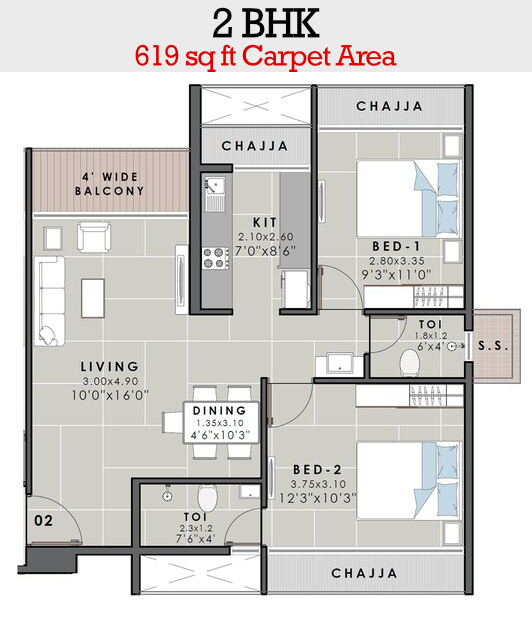 | 2 BHK (619 sq ft carpet) | Back Facing (Quieter Living) | 1 Stack Parking | βΉ 1.80 Cr |
