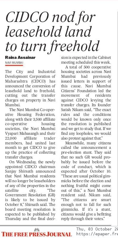 That law is called Navi Mumbai Disposal of Lands act and Navi Mumbai disposal of land rules. - No official announcement was made by any IAS Directors or MD’s or Jt MD’s of CIDCO.